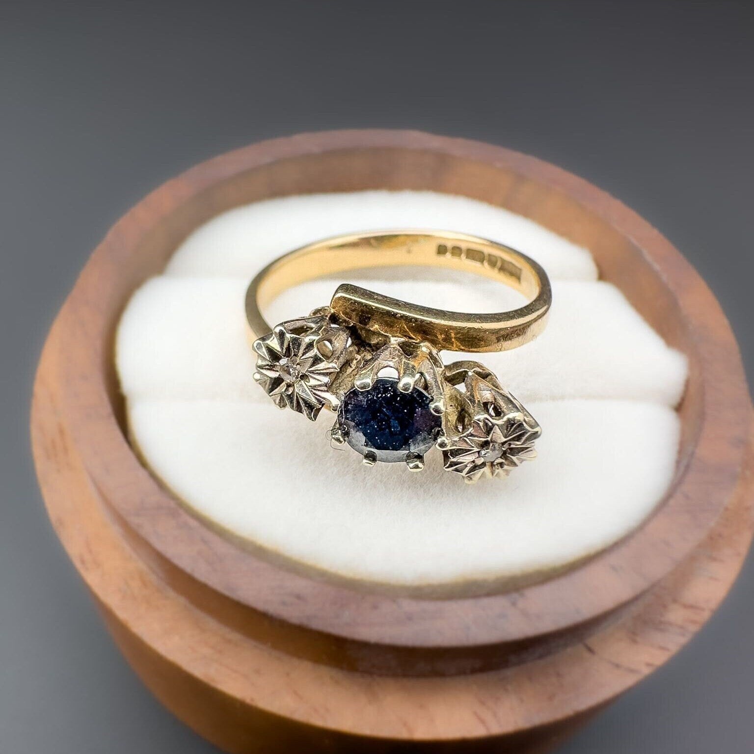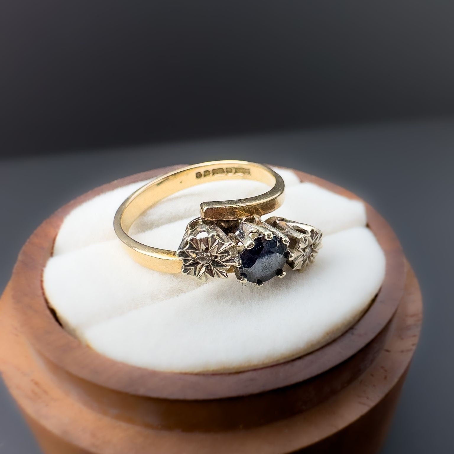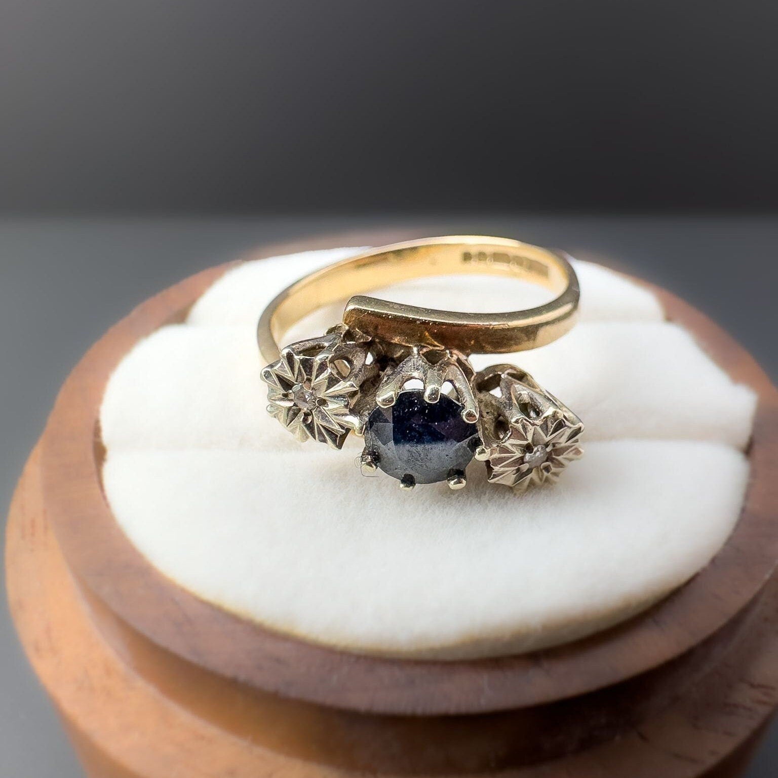 9ct | 9k Gold | Vintage 80s | Sapphire & Diamond Trilogy Twist Ring | Three Stone Ring | English Hallmarks |