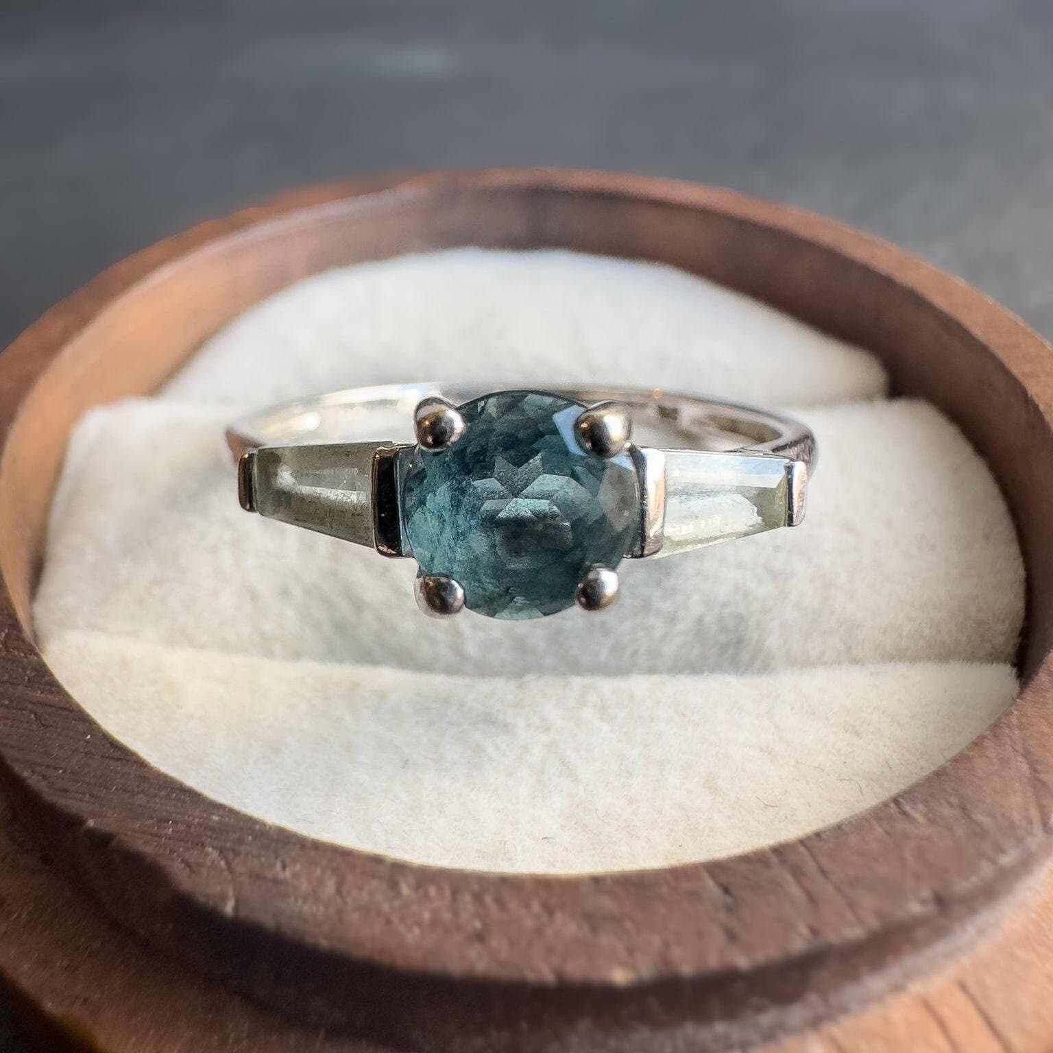 A stunning 9ct solid white gold vintage ring featuring a captivating round-cut blue topaz, complemented by shimmering vari cut aquamarine stones on each side. Crafted with meticulous attention to detail, its perfect for adding a touch of vintage charm to your jewelry collection.