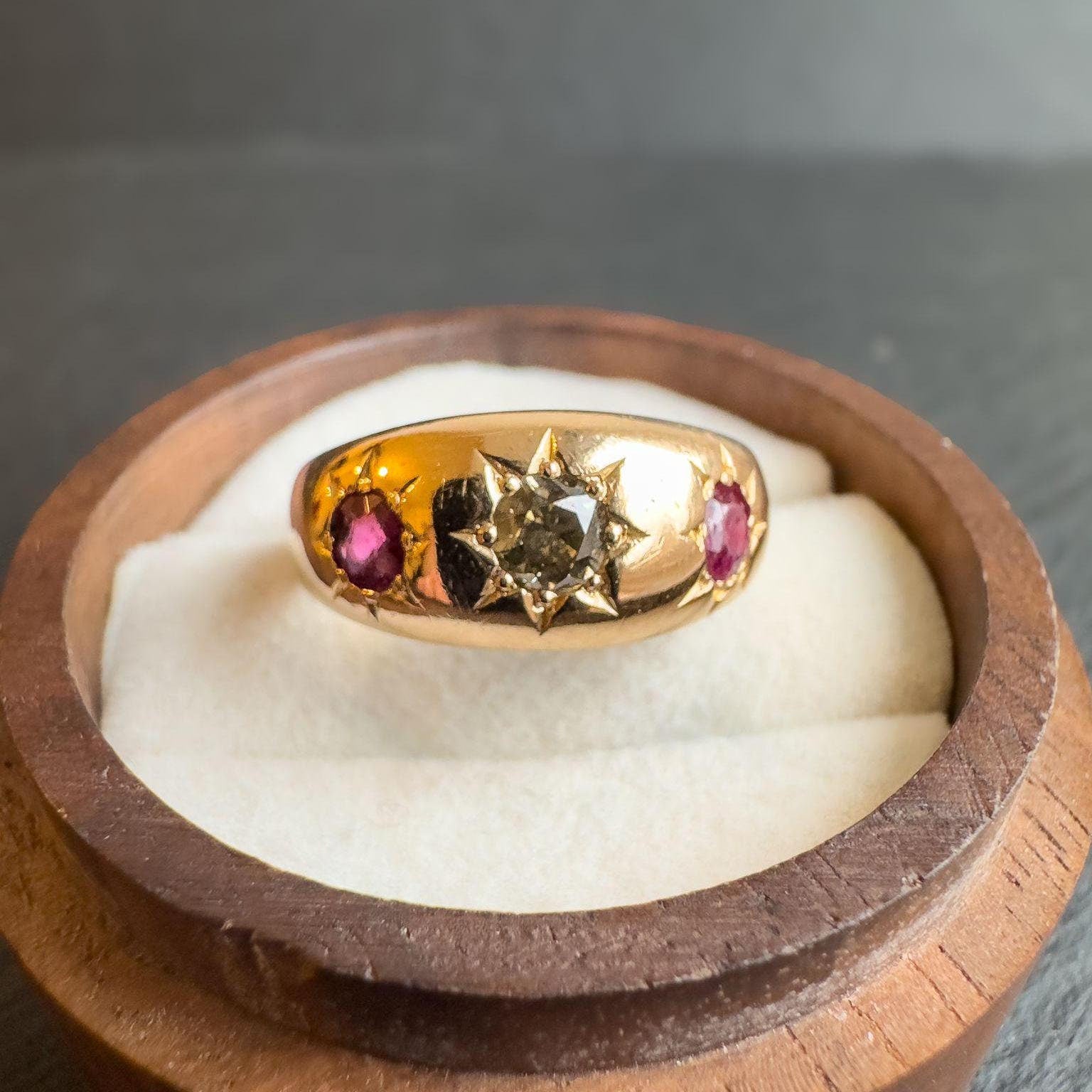 Step back in time with this exquisite 18ct gold Victorian gypsy ring. Featuring a stunning central diamond surrounded by two vibrant rubies, this antique ring showcases the timeless elegance of Victorian craftsmanship. The star-set gemstones are beautifully embedded in the warm glow of 18ct yellow gold, creating a piece that exudes charm and sophistication.